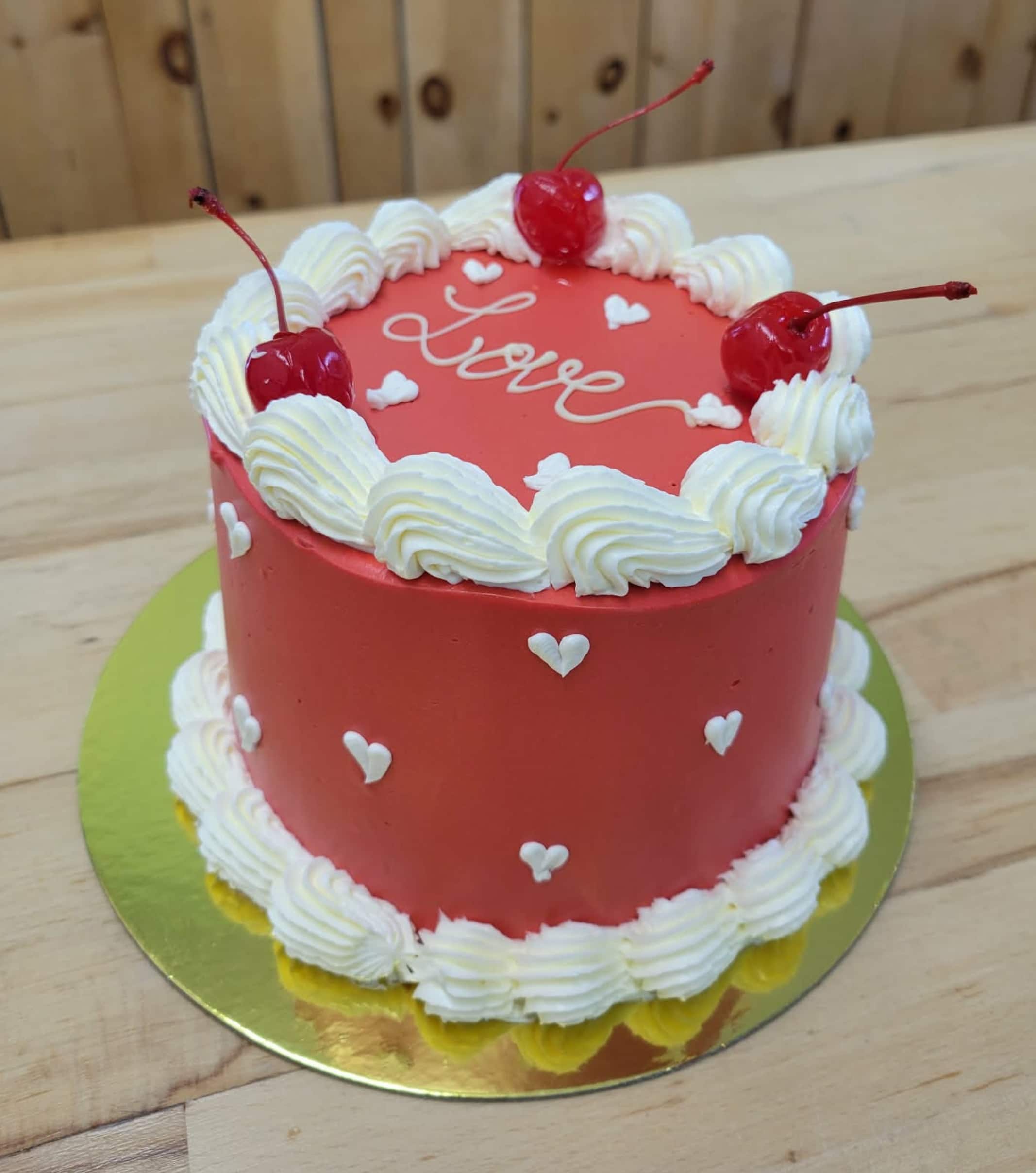 SPÉCIAL ST-VALENTIN : Gâteau chocolat garni de mousse biscuits et crème et ganache chocolat noir, masqué de crème au beurre rose et petits coeurs. Format pour 2 amoureux.