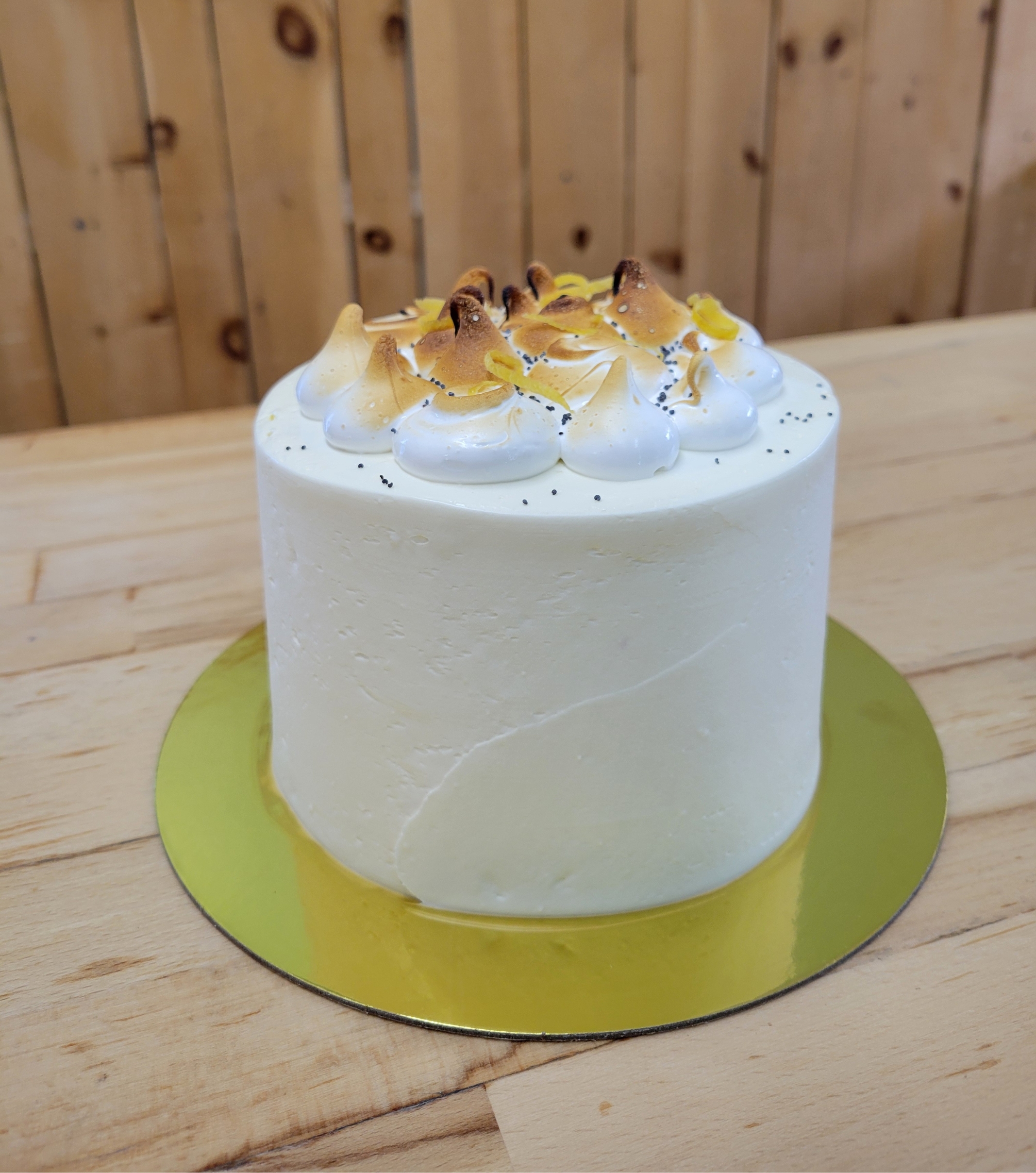 Gâteau à citron et pavot garni de mousse légère au citron, masqué de crème au beurre à la vanille avec un décor de meringue italienne torché. Format pour 6 convives (5 po diamètre).