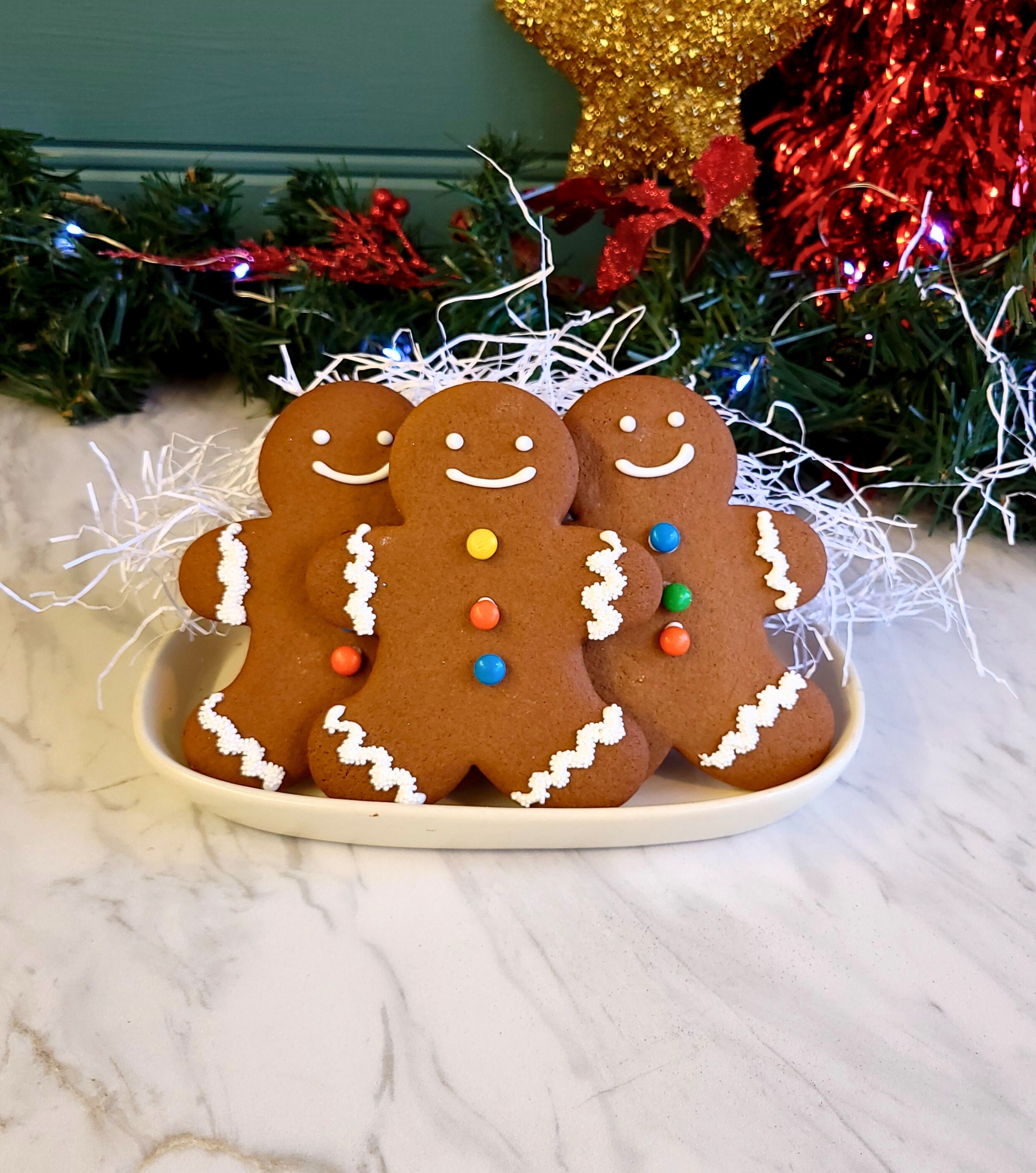 Biscuit bonhomme pain d’épices. Décoré de glace royale, bonbons, chocolats et paillettes.