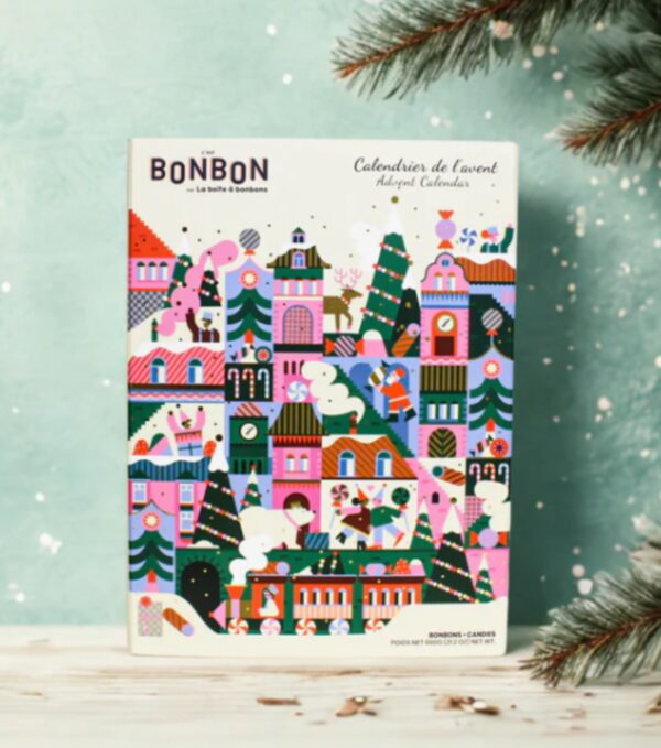 Calendrier de l’avent de la Boîte à Bonbons. 24 sortes de bonbons, surs et doux, et une plus grosse surprise pour le 24 décembre. Chaque case cache entre 3 et 6 bonbons !
